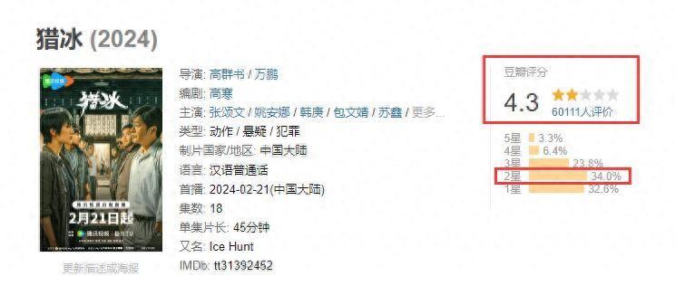 咱们径直看这部剧的口碑就知说念了,限度到现在,豆瓣评分全部滑铁卢,从领先的7.4分全部暴跌,到现如今还是只剩下了4.3分,而给这部剧2星差评的东说念主却是占到了最多量,在6万东说念主的评价中,足足占到了34%,足以发挥,这部剧的口碑究竟有多差了,淌若作念个年度烂剧排名榜,张颂文这部剧怕是能排到第三或者第四的位置。